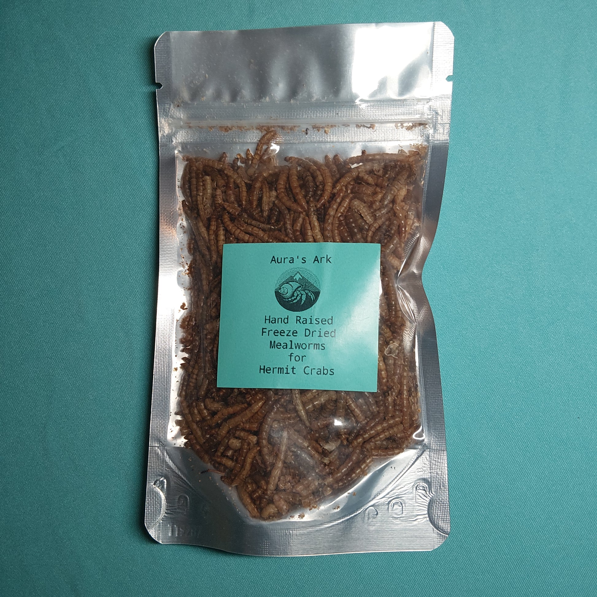 Our mealworms are hand-raised with care and only fed hermit crab-safe foods. Before they’re culled, they’re given a special gutload diet packed with protein and calcium to make them as nutritious as possible. We take extra steps to ensure the culling process is done humanely, and instead of dehydrating, we freeze dry them in my mama’s fancy freeze dry machine!