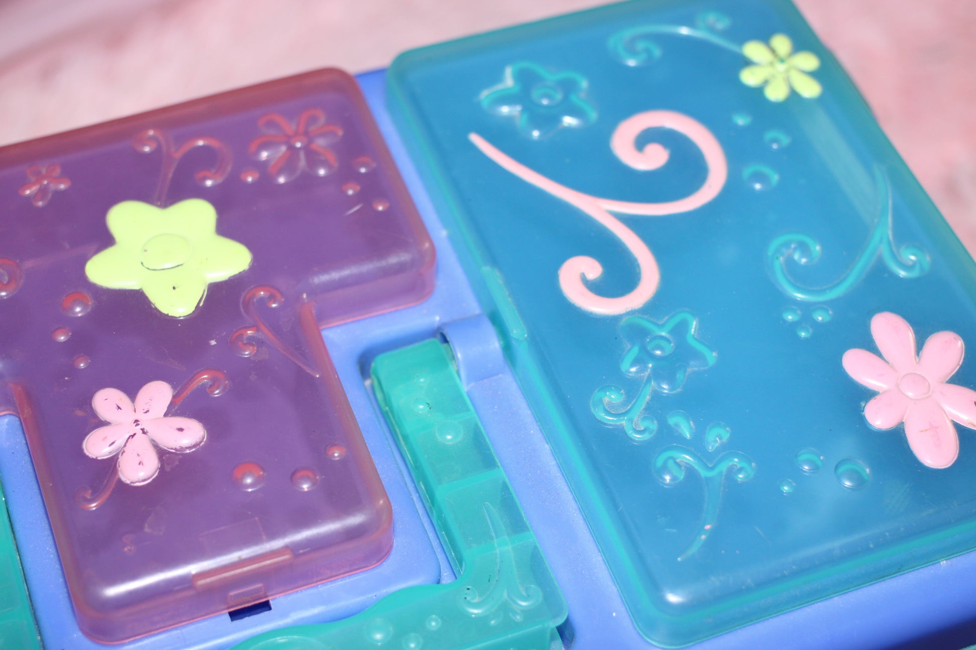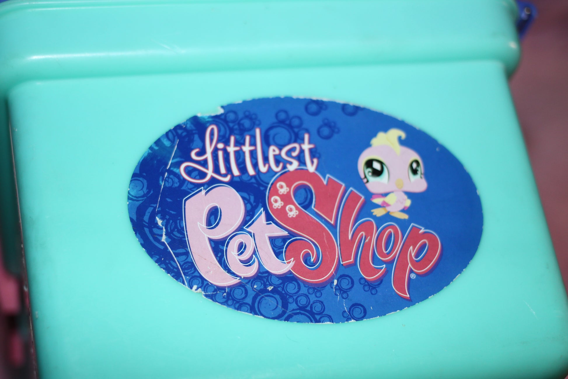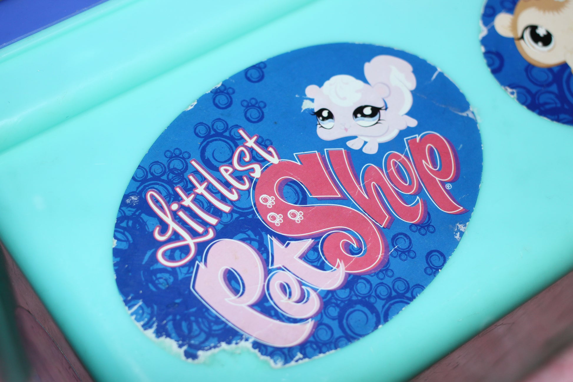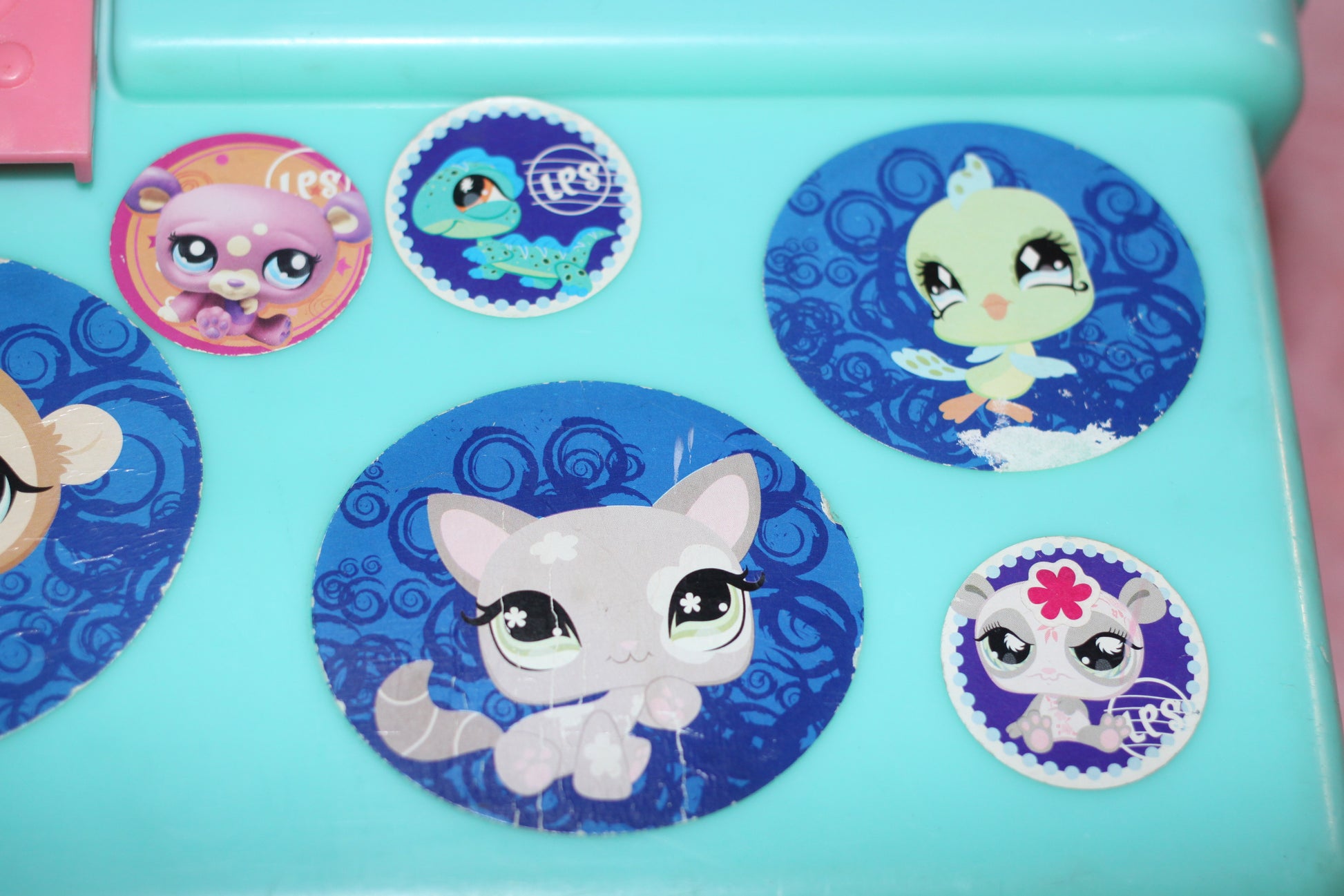This is a loved Littlest Pet Shop Tackle Box in good condition. The stickers are fading and peeling. Nothing is broken. There are scuffs; see pictures. Some rust in hinges, doesnt affect opening.